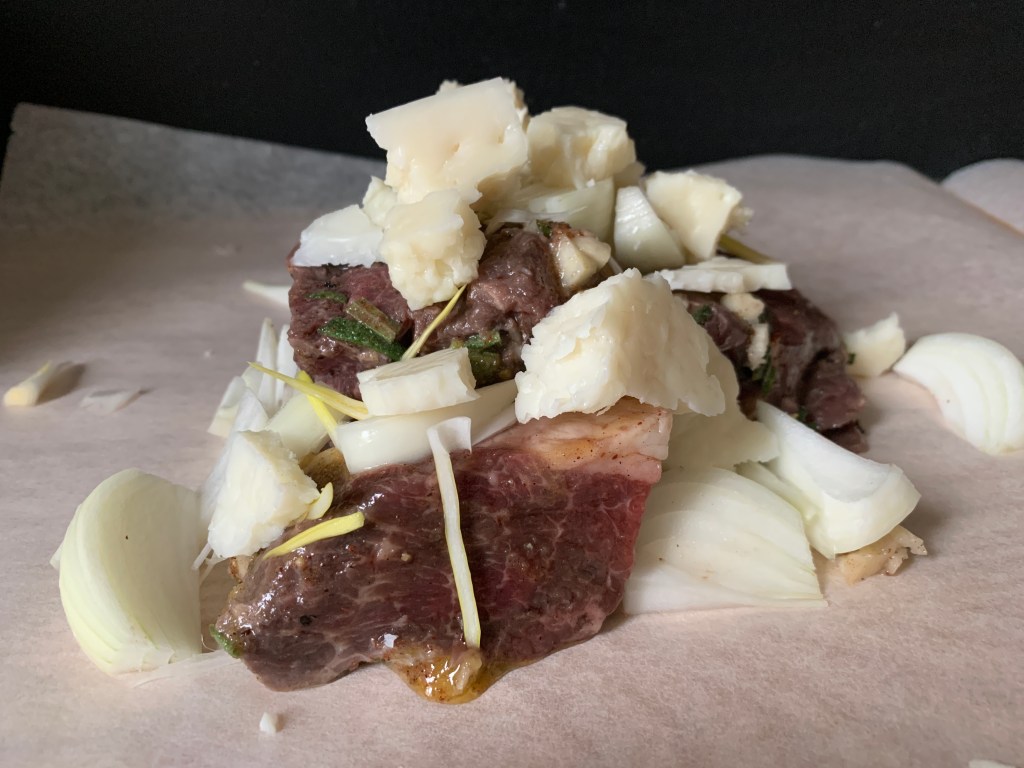 Nelisen tuntia ennen ruoka-aikaa aloita paistaminen. Lämmitä uuni 170 asteeseen. Kääri muutama lihanpala, vähän pilkottua sipulia ja kefalotirijuustoa aina yhteen voipaperikääröön. Voit myös lisätä perunoita jos haluat. Käytä kiinteitä perunoita ja laita ne käärön alimmaiseksi.