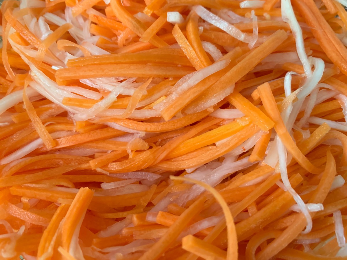 Pilko retikka ja porkkana ohuiksi tikuiksi. Käsin tämä on aikaavievää, mutta mandoliinilla tikut saa aikaan nopeasti. Käytin tässä 3mm julienne-terää, jolla tuli sopivan kokoisia tikkuja.