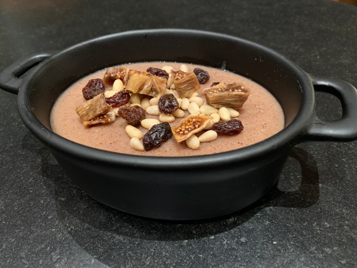 Kun vanukas on jäähtynyt, koristele se pähkinöillä ja kuivatuilla hedelmillä.