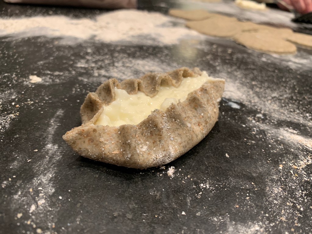 Laita hieman puurotäytettä kunkin kuoren keskelle. Ohut kerros riittää. Käännä sitten kuoren reunat kahdelta vastkkaiselta sivulta täytteen päälle ja rypytä. Rypytyksen voi tehdä joko painellen tai nipistellen, ja kummallakin metodilla saa aikaan erinäköisiä piirakoita.