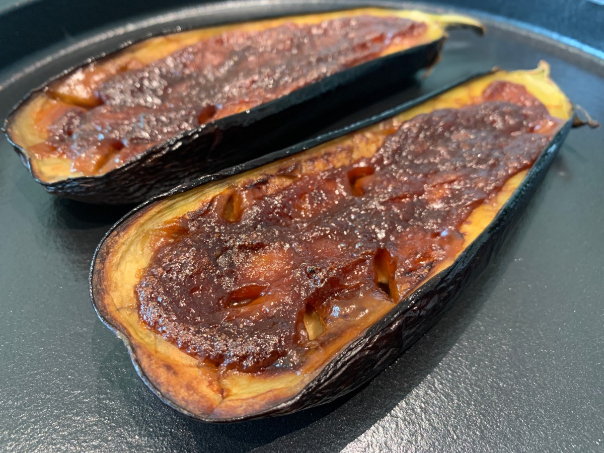 Käännä kypsät munakoisot halkaistu puoli ylöspäin ja levitä kullekin neljäsosa miso dengakusta. Paahda munakoisoja vielä hetki uunissa niin, että miso dengaku alkaa kuplia.