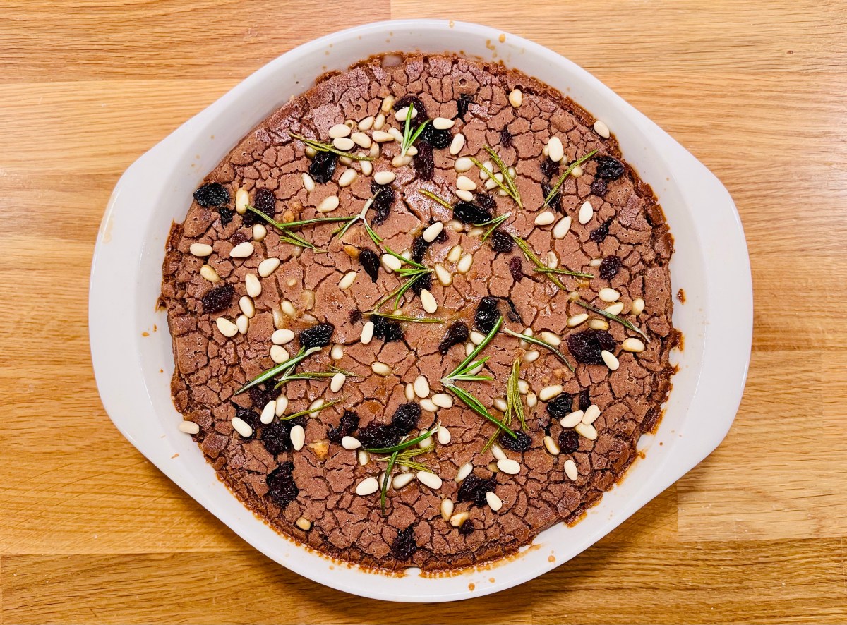 Paista uunissa 180 asteessa 30-45 minuuttia, kunnes castagnaccio on jähmettynyt ja hieman ruskistunut pinnalta.