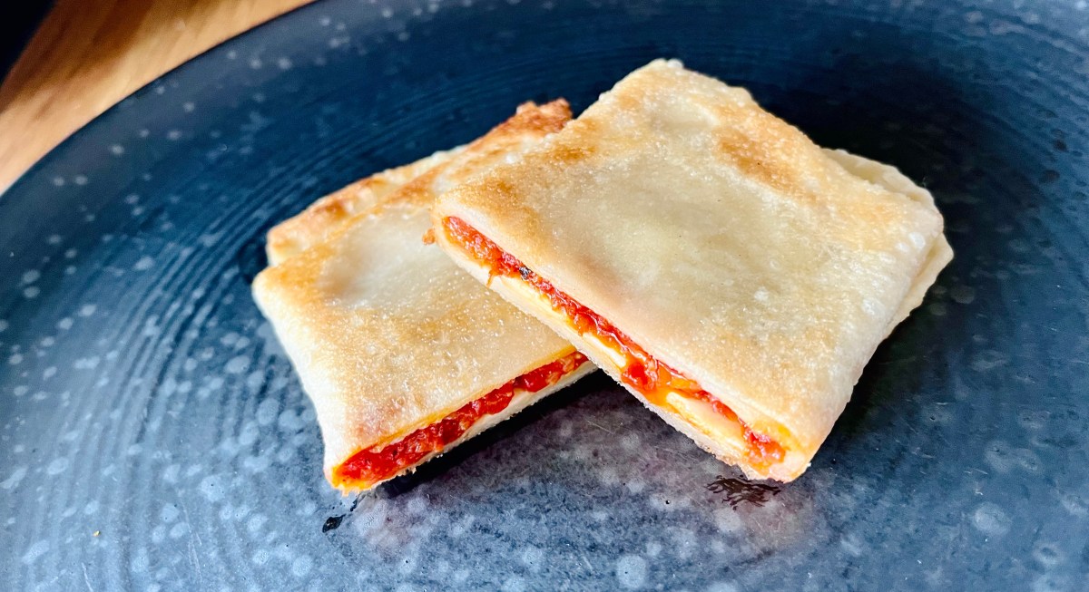 Levitä taikinapallon pintaan oliiviöljyä ja öljyä myös työstötaso. Kauli taikina hyvin ohueksi. Kääntele ensin kahdelta puolelta reunat keskelle niin, että taikina on jokseenkin suorakulmion muotoinen.