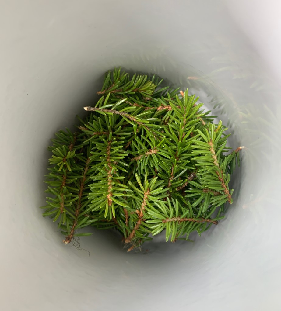 Kerää kuusen oksien kärjistä viiden sentin pätkiä tai, jos satut oikeaan aikaan viodesta asialle, kuusenkerkkiä.
