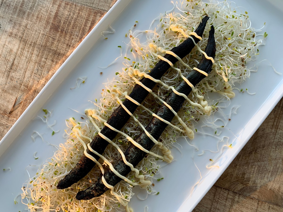 Levitä vihannekset pediksi tarjoiluastiaan. Lämmitä hiilostettu nahkiainen nopeasti grillivastuksilla uunissa. Asettele nahkiaiset kasvispedille ja ruiski päälle kauniit raidat kewpiemajoneesia.