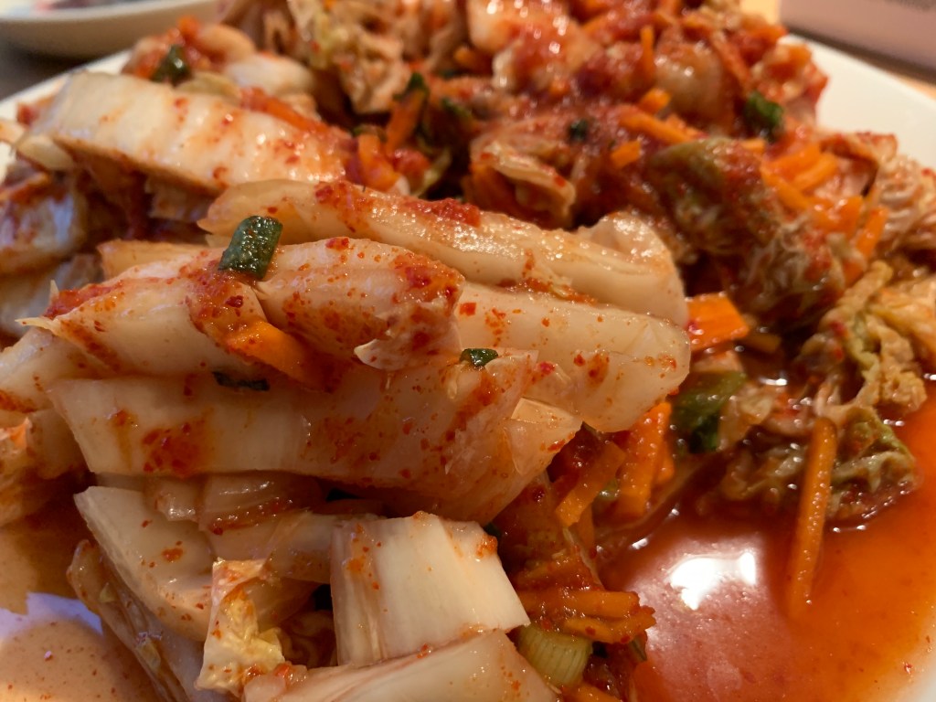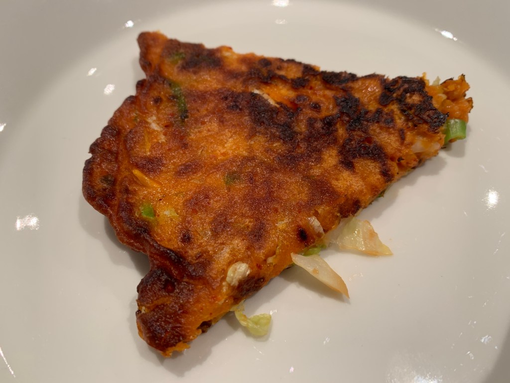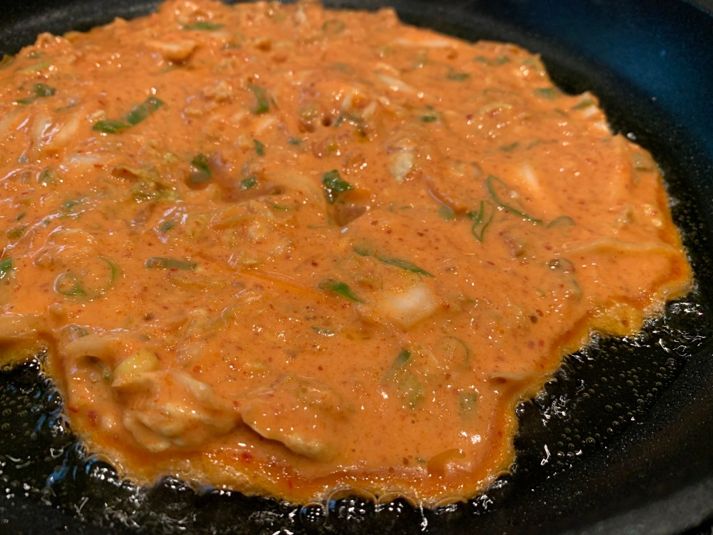 Kimchilettu, kimchi jeon, 김치전, tai kimchi buchimgae, 김치부침개, on kuin hieman syvemmän makuinen ja tulisempi versio porkkanaletusta. Se myös valmistuu näppärästi.