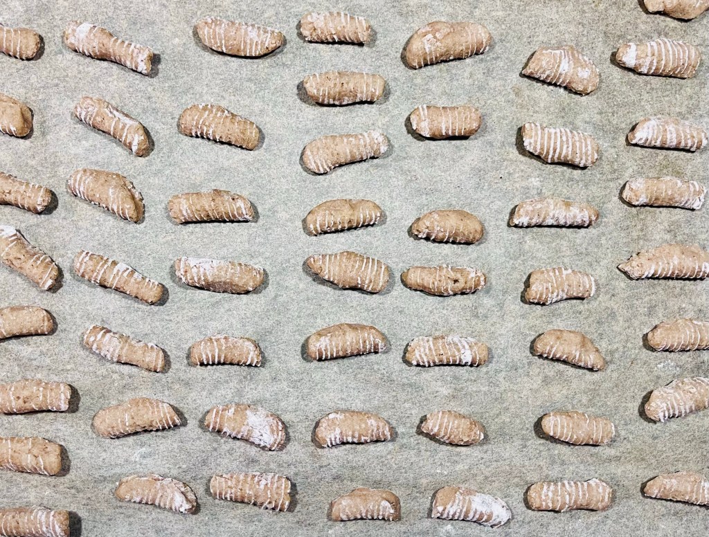 Gnocchilauta, joka on puulevy täynnä uurteita. Gnocchi painetaan vasten puulautaa ja taivutetaan päät yhteen, jolloin ulkopintaan muodostuu laudan kuvio.