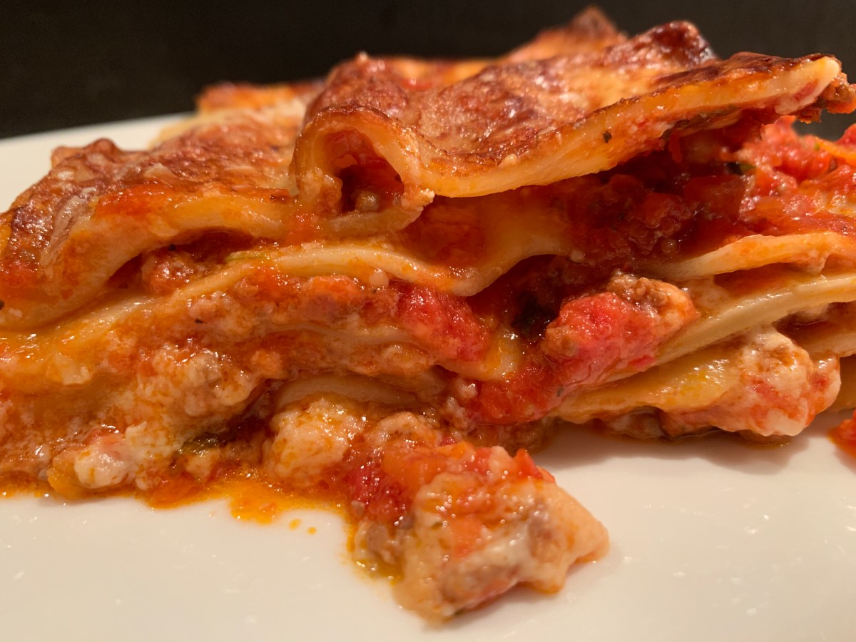 Lopulta lasagne kootaan paistovuokaan, vorotellen lasagnelevyjä, napoletanakastiketta, valkokastiketta, parmigiano reggiano -raastetta. Alimmaiseksi tuppaan laittaa lasagnelevyn, ja päällimmäiseksi lasagnelevyn päälle valkokastiketta ja juustoraastetta.
