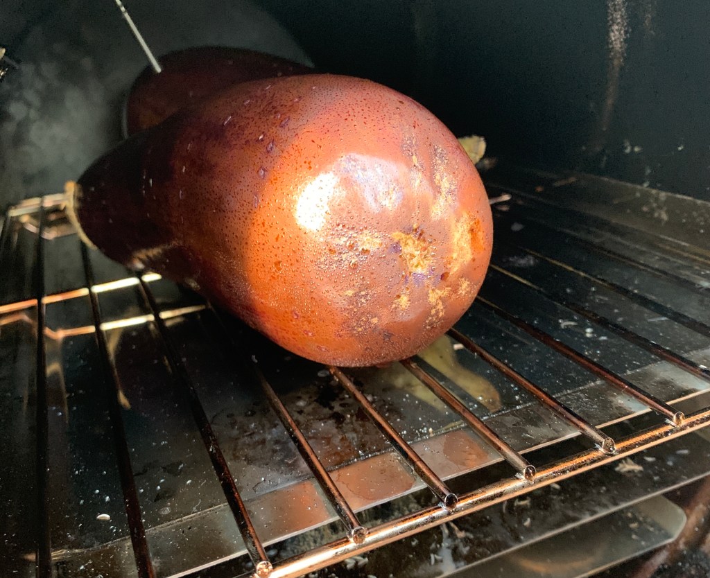 Töki munakoisoon reikiä haarukalla. Lämmitä savustin tai ota esiin savustuspussi. Laita munakoiso savustumaan valitulla menetelmällä, ja anna sen savustua vartista puoleen tuntia, riippuen halutun savuaromin määrästä.