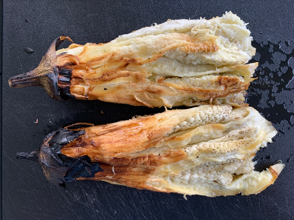 Savustettu munakoiso on monen Lähi-idän ruoan osa. Oikeastaan munakoisoa ei savusteta, vaan sitä pitäisi grillata. Pinnan mustuessa muodostuu myös savuaromia. En ole aiemmin tässä menetelmässä kummemmin onnistunut, mutta tarpeeksi monella yrittämällä sekin onnistui! Grillauksesta saatava aromi on hieman erilainen kuin suorassa savustuksessa, mutta sisältää paahteisuuden lisäksi sopivasti savuaromia. Molemmat sopivat, riippuen ihan siitä kuinka paljon savuaromia kaipaa.