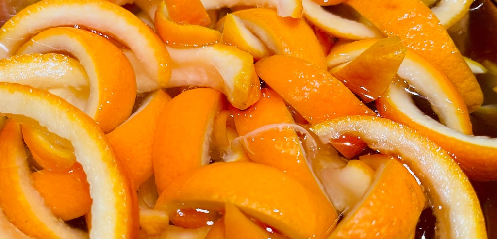 Mittaa kattilaan vettä ja sokeria 1:1-suhteessa sen verran, että appelsiininkuoret peittyvät. Keitä appelsiininkuoria 1-3 tuntia, kunnes kuoren valkoinen osa alkaa muuttua läpikuultavaksi.