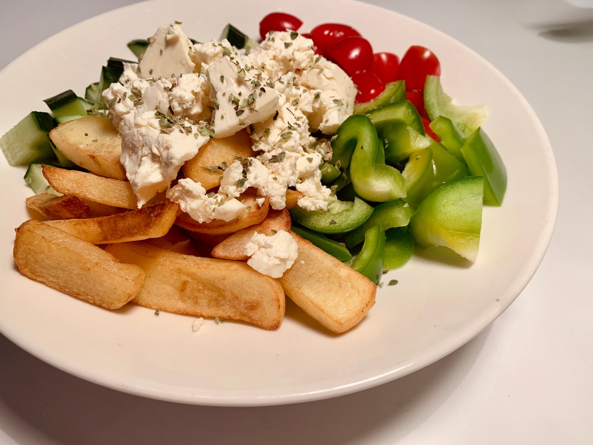 Kokoa kulhoon lohkoperunoita ja vihanneksia sopivaan asetelmaan. Murenna päälle fetaa ja mausta oliiviöljyllä, suolalla ja mustapippurilla.