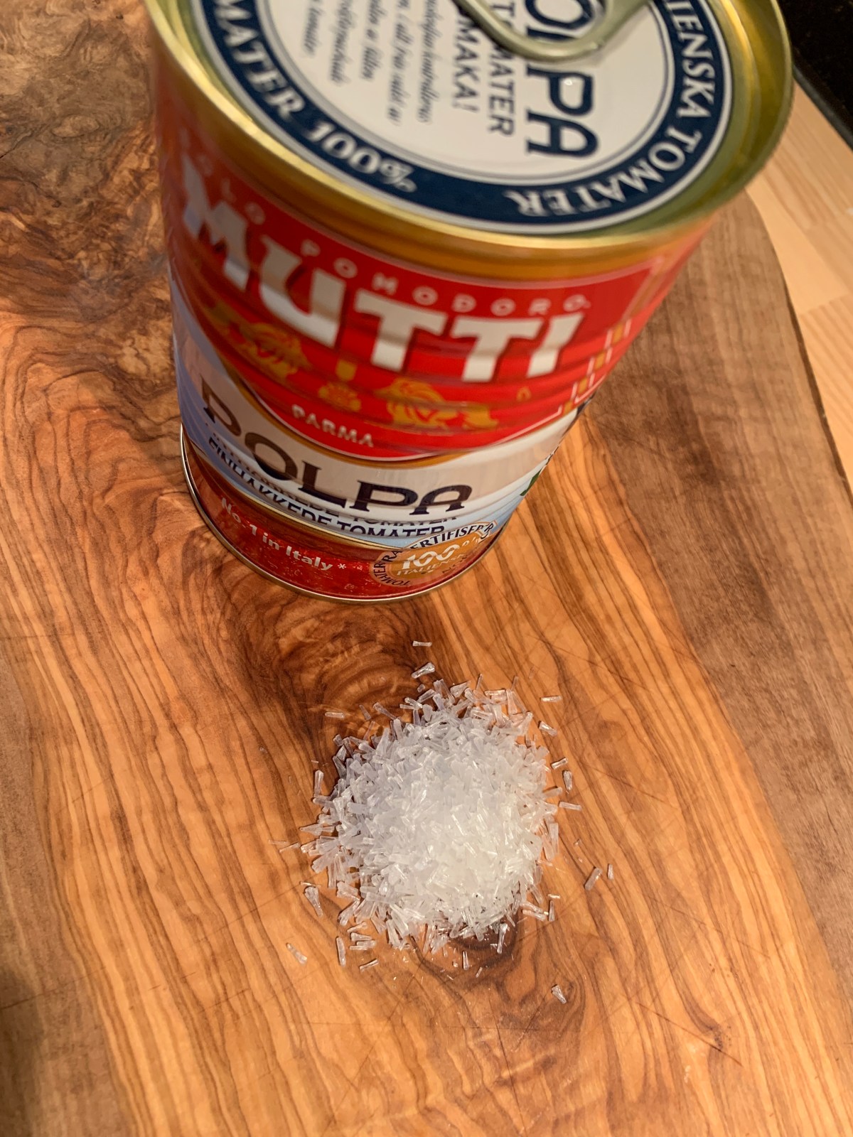 Yhdessä 400 gramman purkillisessa Muttin tomaattimurskaa lienee siis 2.4 grammaa vapaata glutamaattia. Natriumglutamaattimassana se vastaa noin kolmea grammaa. Postauksessa ylhäällä olevassa kuvassa natriumglutamaattia on leikkuulaudalla jokseenkin saman verran kuin sitä löytyy kuvan Mutti-purkista.