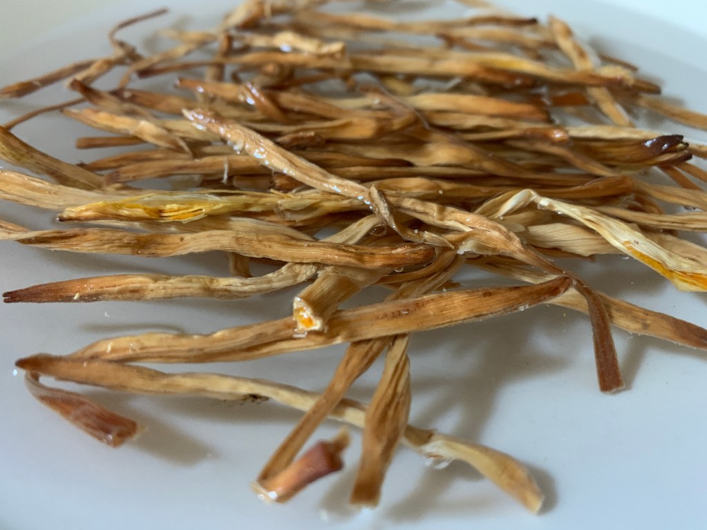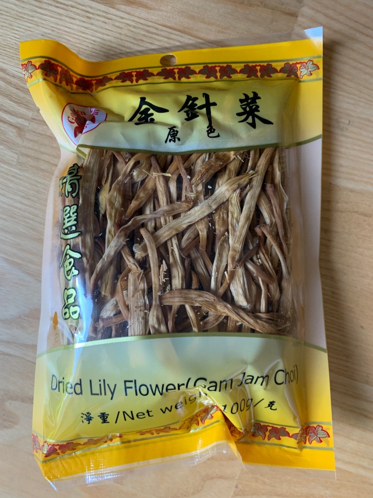 Ostin kerran aasialaisesta marketista päivänliljan kukkia kuivattuina. En kuitenkaan löytänyt niille käyttöä, ennen kuin tässä ruokalajissa. Päivänliljan kukkia (day lily flowers) löytyy useimmista kiinalaisia tuotteita myyvistä marketeista.