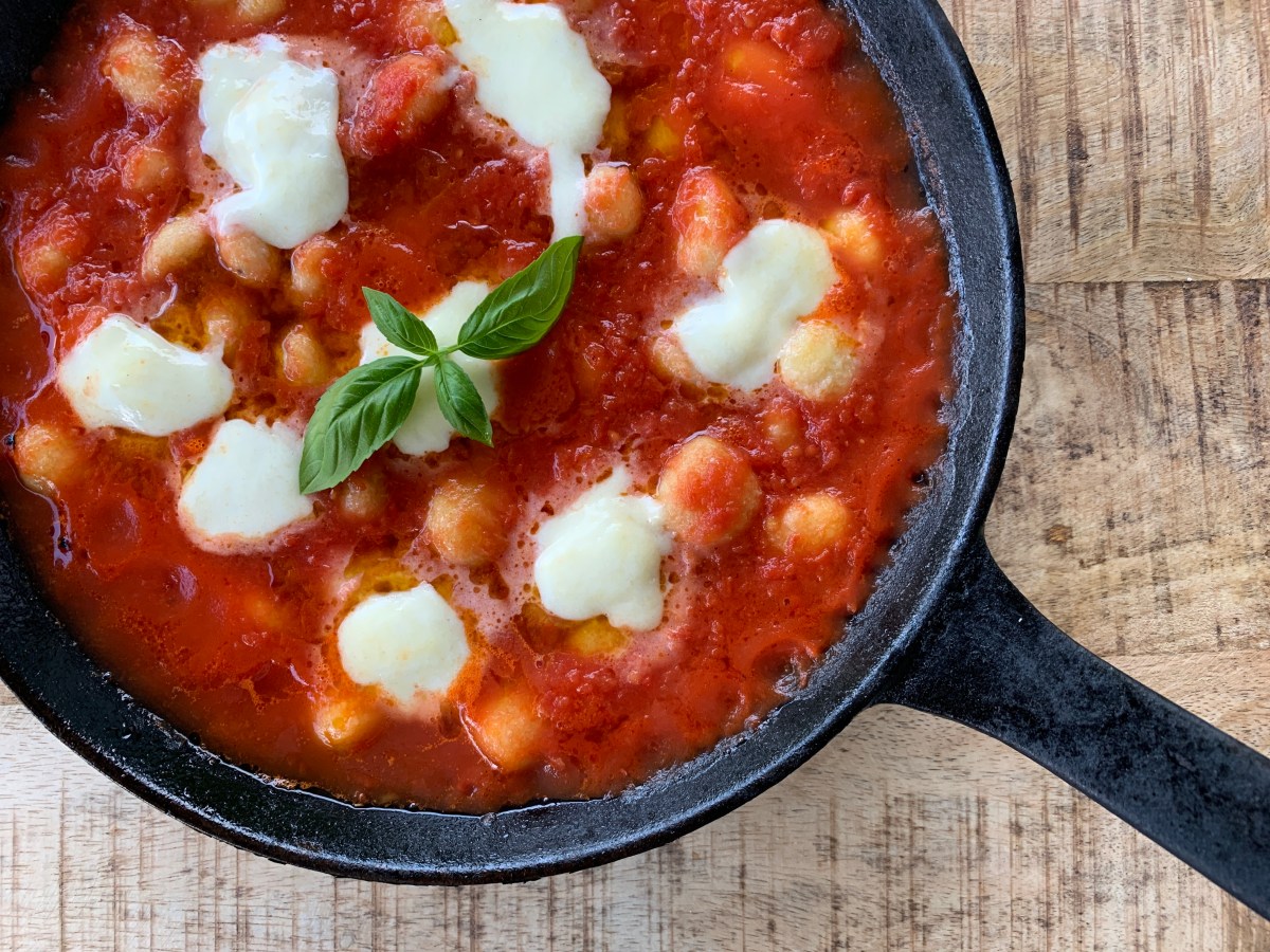 Lämmitä tomaattimurska kattilassa oliiviöljyn, suolan, pilkotun valkosipulin ja laakerinlehden kera. Tarkista suola. Lisää sekaan gnocchit ja kaada seos uunivuokaan.