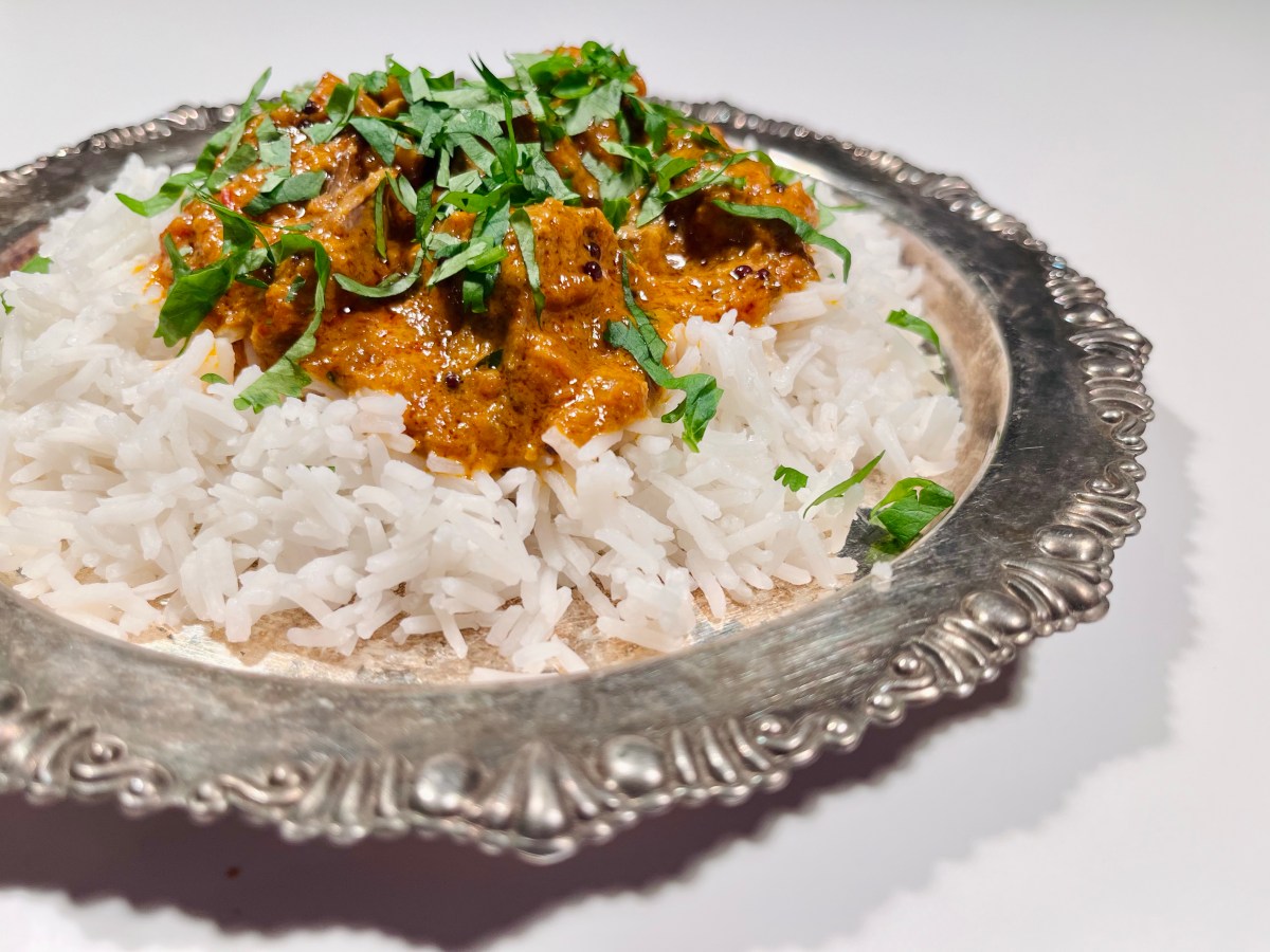 Anna curryn hautua niin, että öljy erottuu. Tähän kestää tyypillisesti 1 1/2 – 2 tuntia. Lisää sitten ruusuvesi ja halkaistu chilipaprika.