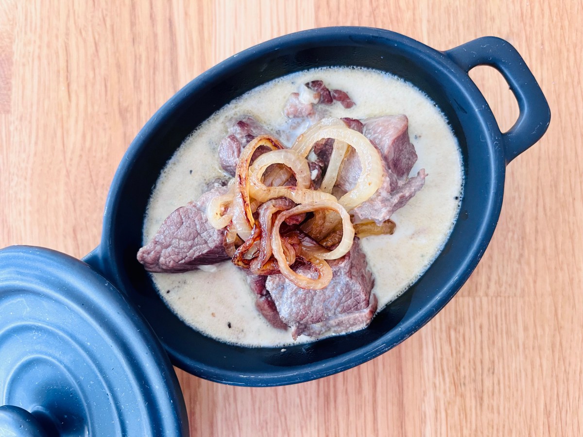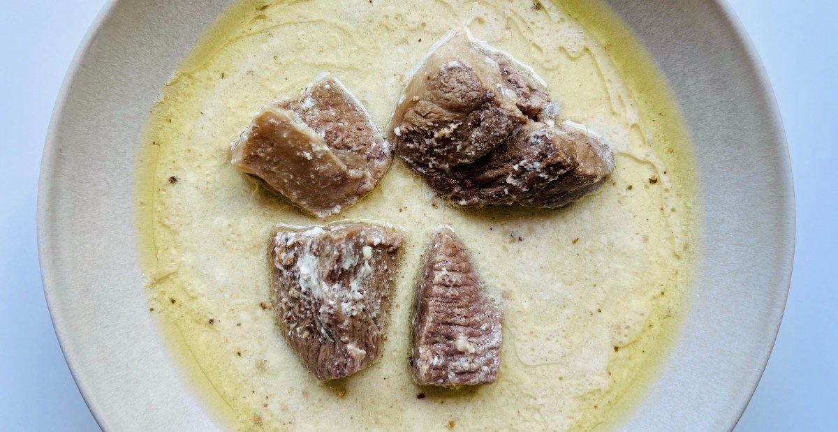 Lämmitä voita kattilassa ja paista lihaa hetki. Lisää kondensoitu maito, mustapippuri ja suolaa sekä lientä maun mukaan. Anna lihan hautua ylikypsäksi.