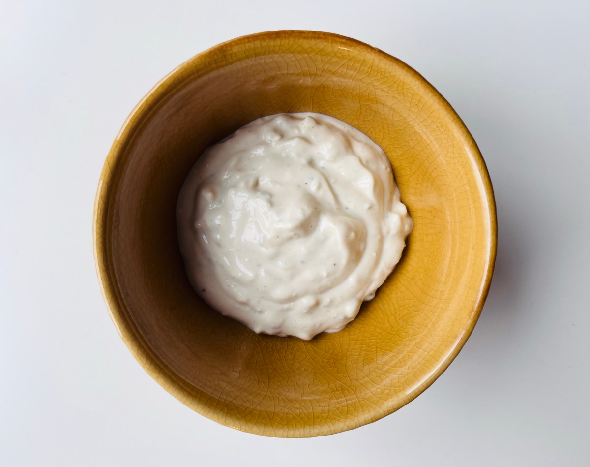 Vispaa keskenään majoneesi ja crème fraîche. Lisää mausteet.