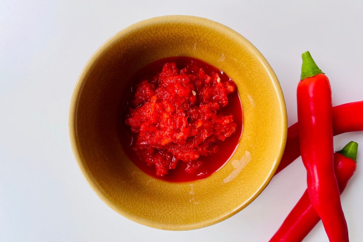 Poista chilipaprikoista siemenet. Pilko ne sitten siivuiksi ja soseuta haluamaasi koostumukseen tehosekoittimella.