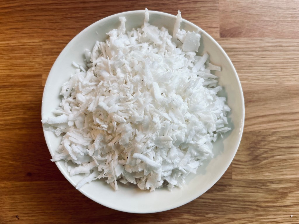 Kuori kookospähkinä. Lyö pähkinä ensin rikki ja poista kova kuori. Poista pähkinän sisuksesta ruskea pinta kuorimaveitsellä. Raasta sitten kookospähkinä raastinraudan isolla terällä.