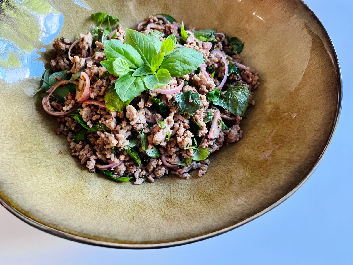 Larbon salaatti, joka kuitenkin sisältää pääasiassa lihaa. Larb on maustettu hieman yunnanilaisen mintun ja naudanlihan tapaan erilaisilla yrteillä, mutta eteläisemmät kalakastikkeen aromit tekevät mausta kovin erilaisen.
