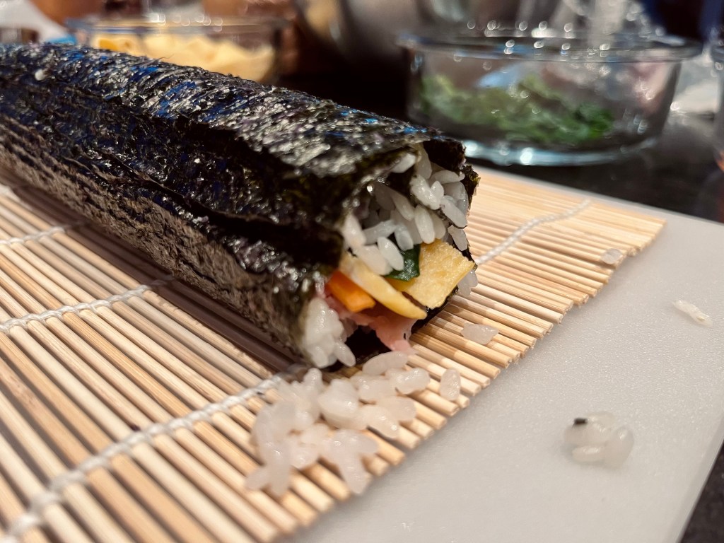 Kokoaminen tapahtuu bambumaton avulla makisushin tapaan. Asettele matolle norimerileväarkki ja 4/5-osalle sen pinnasta riisiä noin sentin kerros. Asettele sitten riisin keskelle täytteet. Rullaa rulla rullaksi aloittaen riisiä reunaan asti omaavasta päästä.