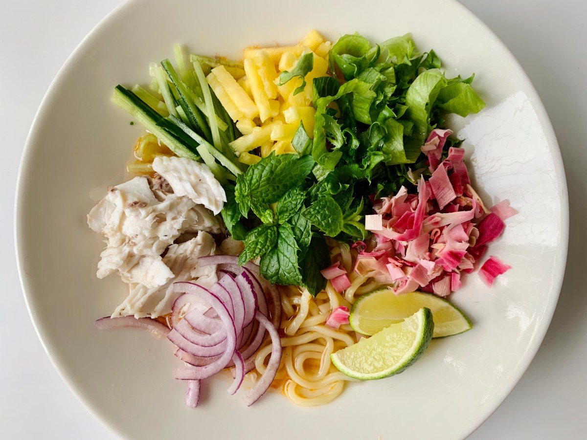 Alla olevassa reseptissä on vain perusnuudelien raaka-aineet. Salaattiin sopii lisäksi erilaisia vihanneksia, kurkkkutikkuja, porkkanatikkuja, ituja ja niin edelleen, sekä keitetty kananmuna.