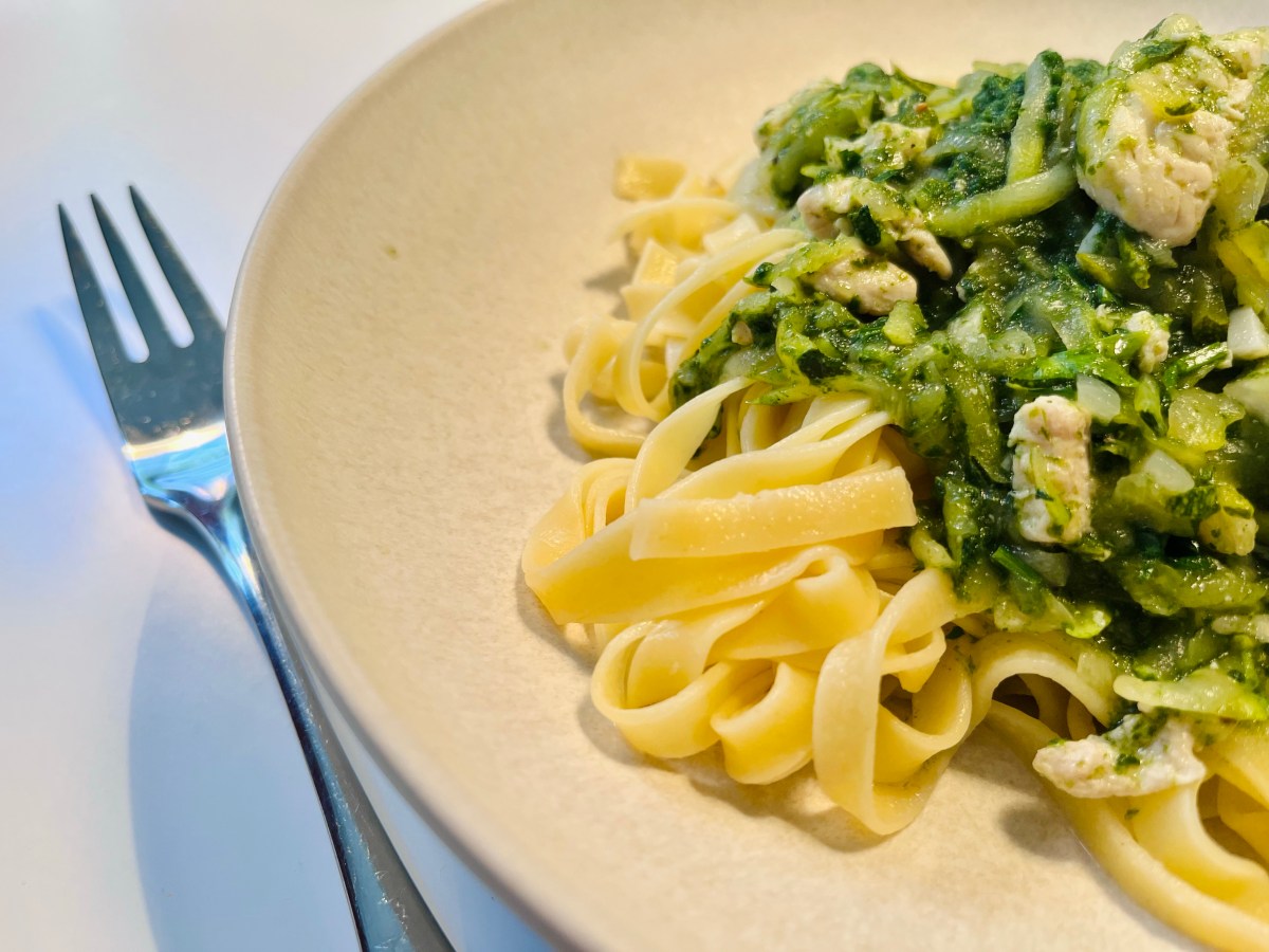 Kesäkurpitsaa saa nyt halvalla, ellei sattumalta pihalla kasva iso yksilö. Tähän reseptiin saa käytettyä suuren määrän kesäkurpitsaa, jos sille ei muuta käyttöä keksi. Kesäkurpitsaraaste muodostaa tässä pastakastikkeen lähes yksinään.