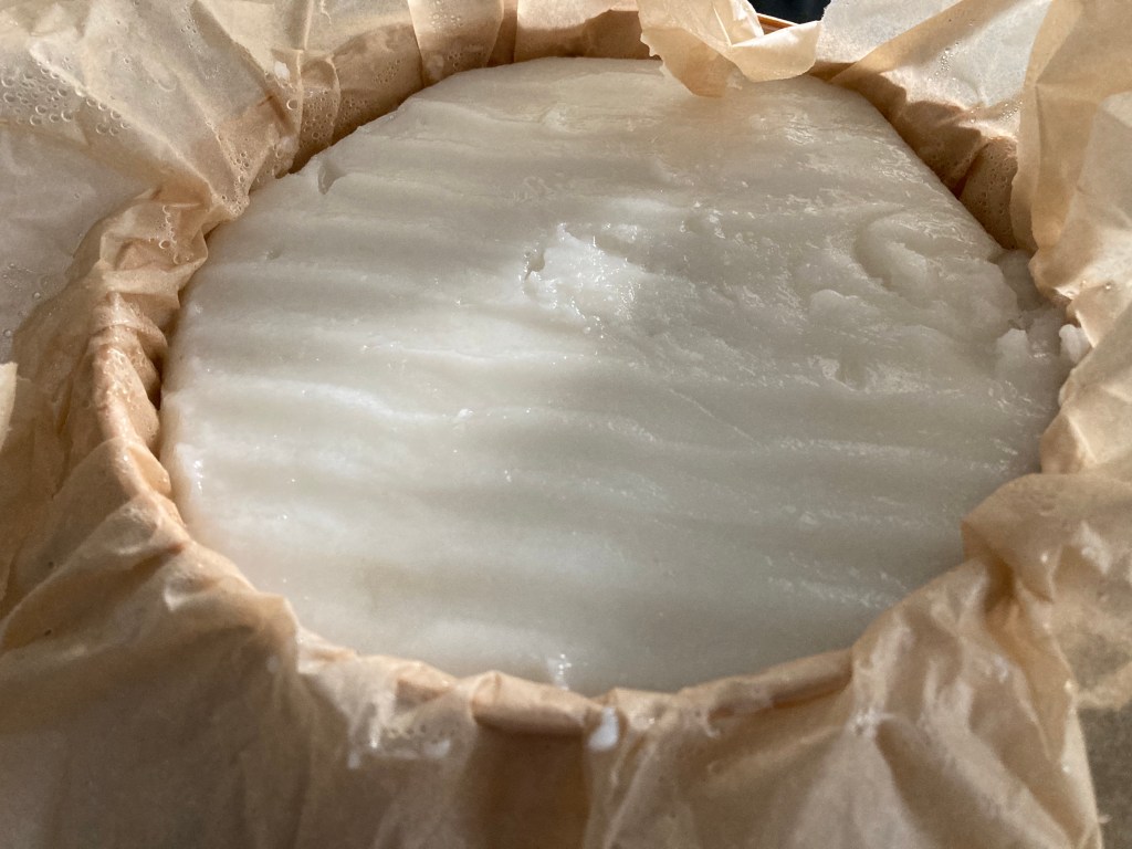 Seuraavaksi taikina on höyrytettävä. Vuoraa höyrytyskori leivinpaperilla ja kaada taikina leivinpaperille. Höyrytä taikinaa kymmenisen minuuttia tai kunnes se on kypsää eli ei enää yhtään valkoista.