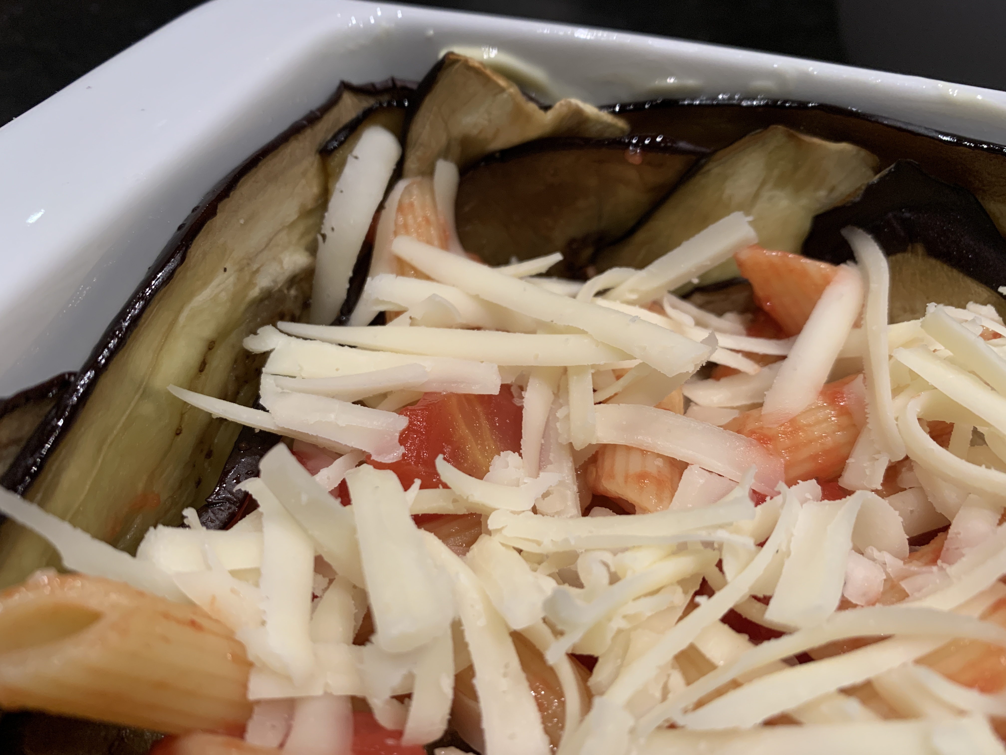 Valitse sopivan kokoinen vuoka ja voitele se. Vuoraa vuoka munakoisosiivuilla. Kaada pasta-raguseos vuokaan. Ripottele päälle loppu juusto.