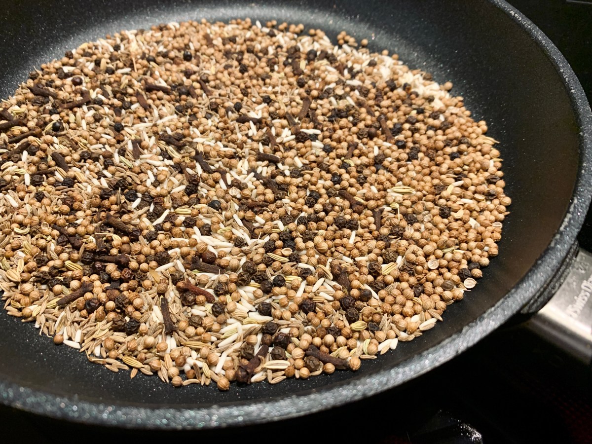Lämmitä öljy pannulla ja lisää siihen juustokuminan- ja sinapinsiemenet. Anna niiden lämmetä hetki ja lisää sitten chilirouhe. Kun chilirouhe on antanut väriä öljyyn, lisää sipuli ja valkosipuli ja kuullota niitä hetki. Lisää kaali, kurkuma ja kookoshiutaleet ja anna hautua vartin verran.