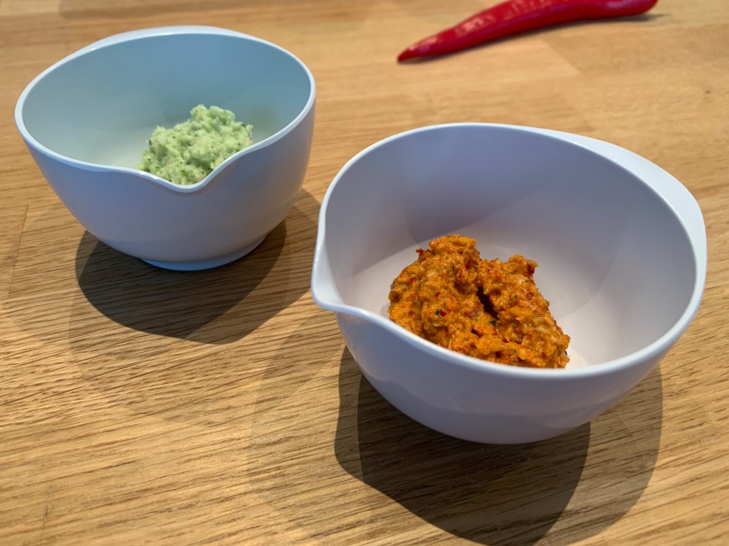 Saat aikaan kahdenlaista tahnaa kun murskaat ensin kaiken muun paitsi kostutetun chilirouheen. Kostutettu chilirouhe on helppo lisätä sekaan aivan lopuksi.